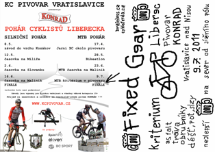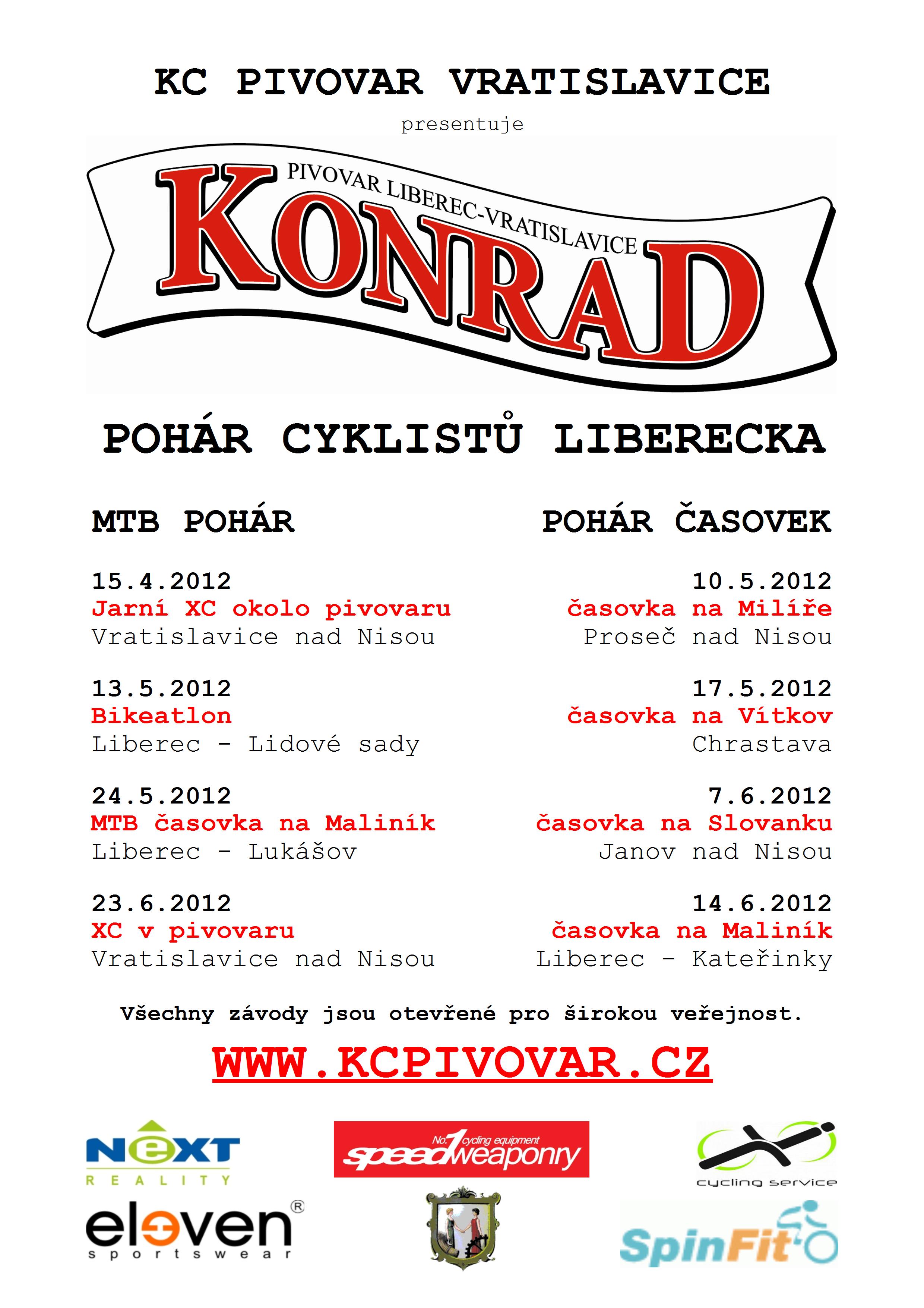KONR�D MTB poh�r Liberecka 2014 Skladba MTB z�vod� se v leto�n�m roce m�rn� zm�nila. St�lic� je v�ak rozhodn� jarn� XCO z�vod v bezprost�edn�m okol� pivovarsk�ch rybn�k�, kter� cel� seri�l v polovin� dubna p��mo v are�lu Vratislavick�ho pivovaru odstartuje. Zdej�� jezdiv� okruh letos doznal n�kolika zm�n, konkr�tn� na n�m p�ibyly dal�� t�i nov� singletrack �seky. Ned�lnou sou��st� je tak� z�vod kategorie SINGLESPEED. A pivo samoz�ejm� bude! Novinkou v leto�n�m ro�n�ku je, �e libereck� Bikeatlon nahrazuje XCO z�vod v nedalek�m Dr�kov�. Kluci z po�adatelsk� party okolo BIKE BROTHERS IMPORT moment�ln� makaj� na nov�m okruhu, tak se m�me na co t�it. T�et�m podnikem je �tvrte�n� MTB �asovka do vrchu do sedla Malin�ku. Organiz�torem je parta z BMC, co� je jako v�dy z�rukou velmi kvalitn�ch cen. V doln� ��sti trati je nav�c nov� zhutn�n� povrch, tak�e je ve h�e p�ekon�n� tra�ov�ho rekordu. Fin�lov� z�vod se odehraje na Mil���ch, a sice atraktivn� formou dvacetikilometrov� Point-To-Point XC trasy s hromadn�m startem. Po�adatel sl�bil, �e zm�rn� z�v�re�n� v��lap k rozhledn�, nicm�n� na techni�ce z kopce dol� se rozhodn� nic ub�rat nebude! Odvoz zavazadel s pot�ebn�m vybaven�m ze startu do c�le pro z�vodn�ky samoz�ejm� zaji�t�n. Ceny v jednotliv�ch z�vodech jsou v�cn� pro prvn� t�i z�vodn�ky v ka�d� kategorii. Za celkov� po�ad� se budou vyhla�ovat v�t�zov� jednotliv�ch kategori�. Sou��st� vyhodnocen� cel�ho seri�lu bude losov�n� o 50l sud Vratislavick�ho piva KONR�D, kde ka�d�mu z��astn�n�mu bude p�id�len po�et losovac�ch l�stk� podle toho, v kolika z�vodech startoval.